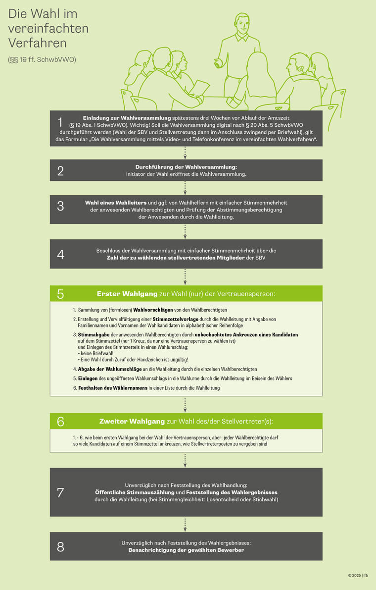 Die Art des Wahlverfahrens ist gesetzlich zwingend in § 177 VI SGB IX vorgegeben. Der gesetzlich gedachte Regelfall sieht das förmliche Wahlverfahren nach §§ 177 VI SGB IX, 1 ff. SchwbVWO, vor. In der Praxis kommt es allerdings überwiegend zum vereinfachten Wahlverfahren, da hier gilt, dass weniger als 50 Wahlberechtigte in einem Betrieb angestellt sind (§§ 177 VI 3 SGB IX, 18 ff. SchwbVWO).